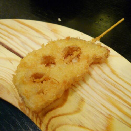 今日の日記は、串揚げの具当てクイズをしたいと思いまーす。これは何の串揚げでしょう? 誰でも分かりますね。レンコンです。私、天ぷらのレンコンをこよなく愛しているのですが、天ぷらにしておいしいものが串揚げでおいしくないわけがないよね。お次はこれ…